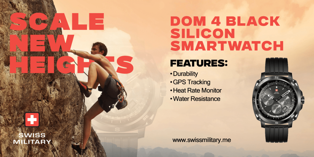 Scale new heights with the DOM 4 Black Silicon Smartwatch! ⌚️💪 Packed with features like durability, GPS tracking, heart rate monitoring, and water resistance, it’s your perfect companion for any adventure.